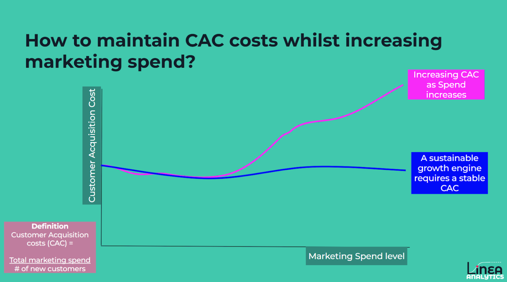 CAC is different to CPA (cost per acquisition). Whereas CAC focuses on the total marketing spend. CPA focuses on the spend of an individual channel/ campaign/ creative.