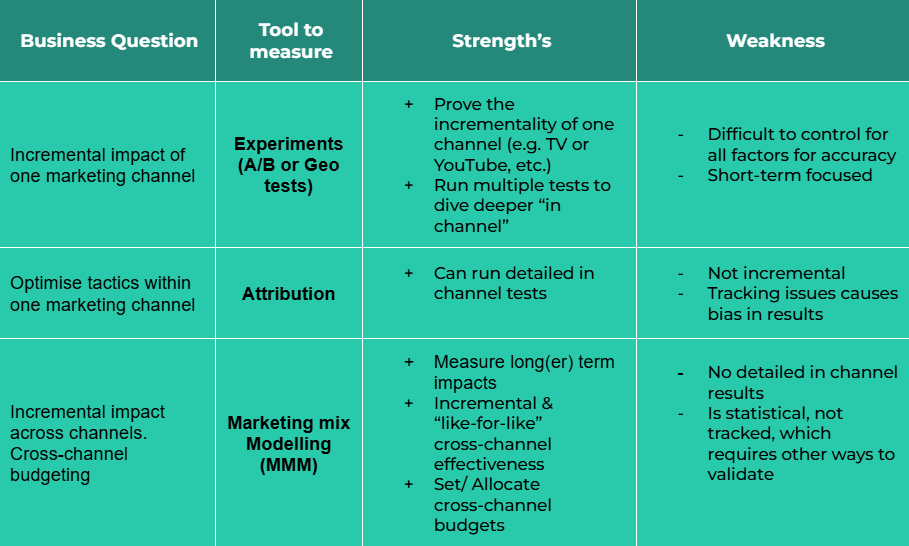Table 1: Mapping questions to marketing measurement tools & the pros/cons of each approach
