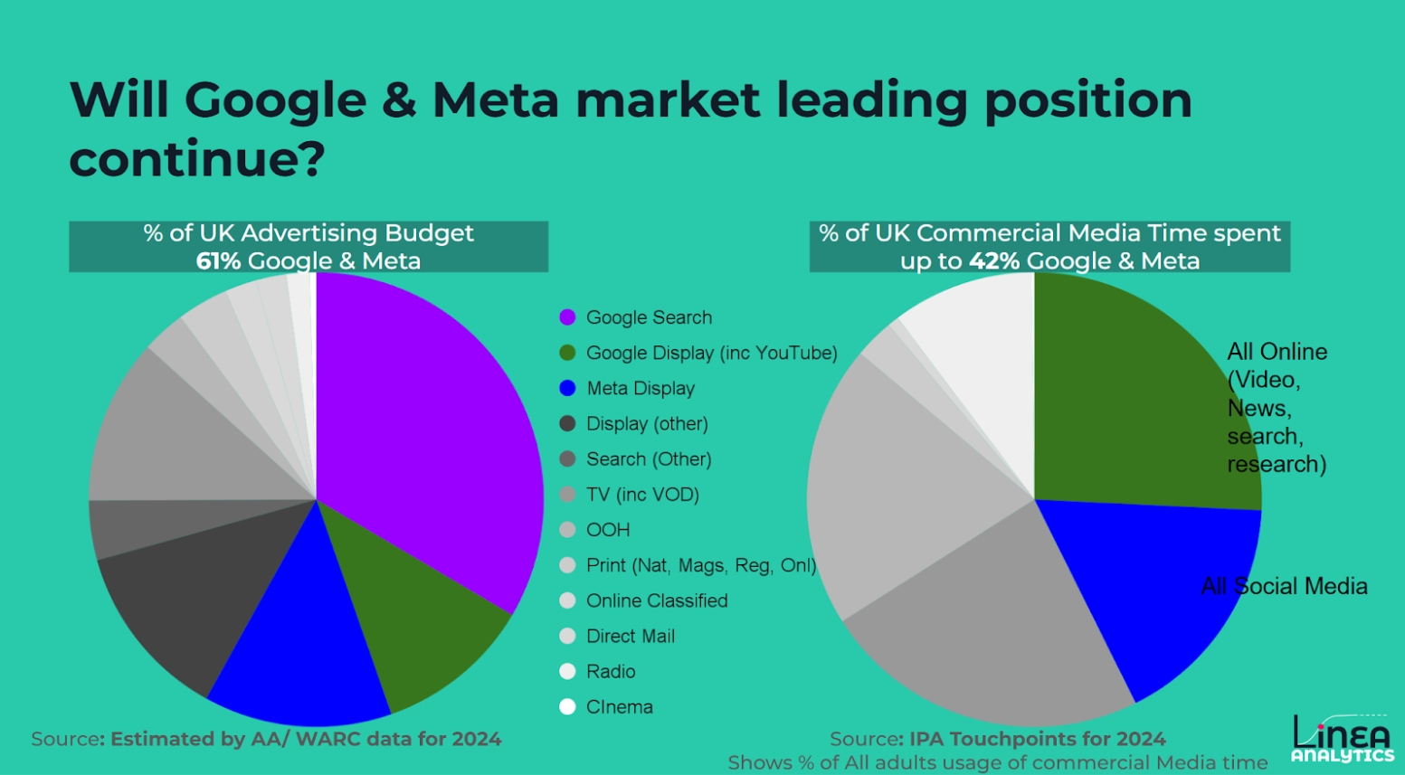 Whether Google and Meta continue to outperform will be central to the measurement work we do at Linea Analytics. What matters most is ensuring that ad spend follows the effectiveness of marketing channels, whether that leads to Google, Meta, or emerging platforms.