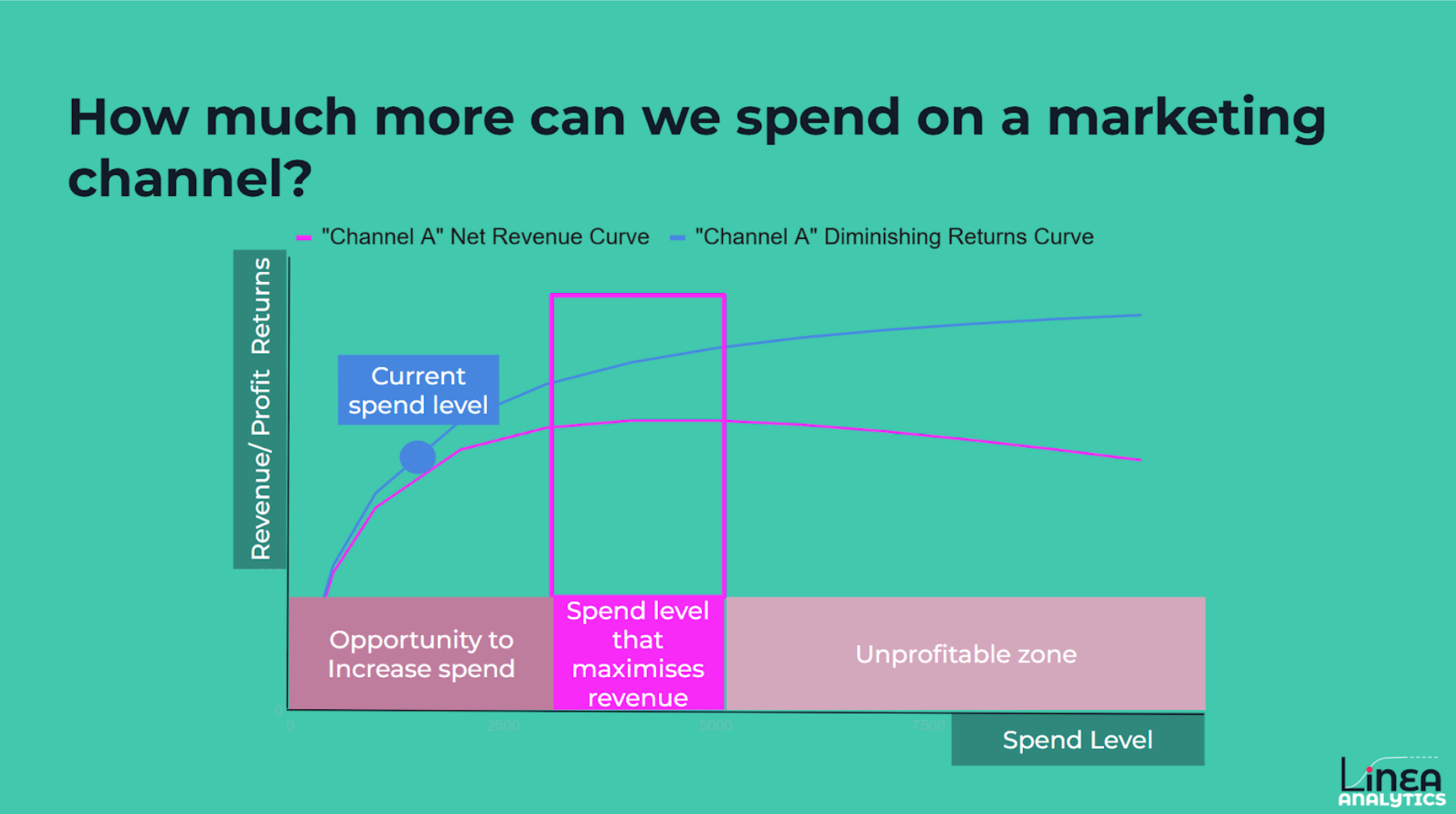 You need a diminishing returns curve - like the example. This tells you, for every additional £/€ you invest in a media channel, how much incremental revenue or profit you can expect in return.